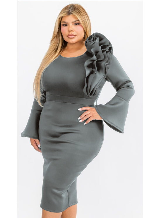 Plus Size Bell Sleeves Elegance Flower Shoulder Detail Midi Dresses