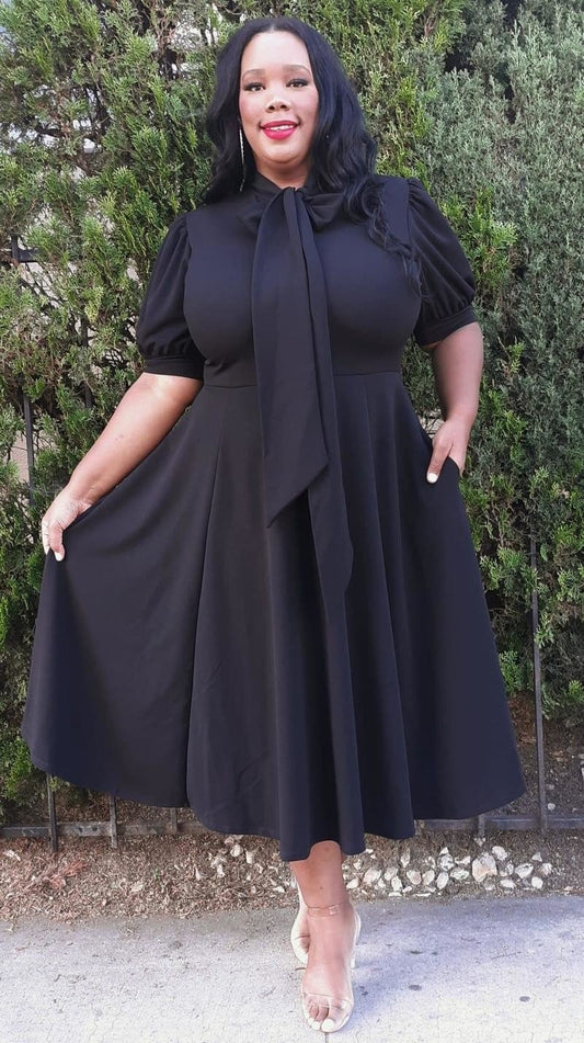 Plus Size 3/4 Bishop Sleeves Big Bow Neck Flare Midi Dress