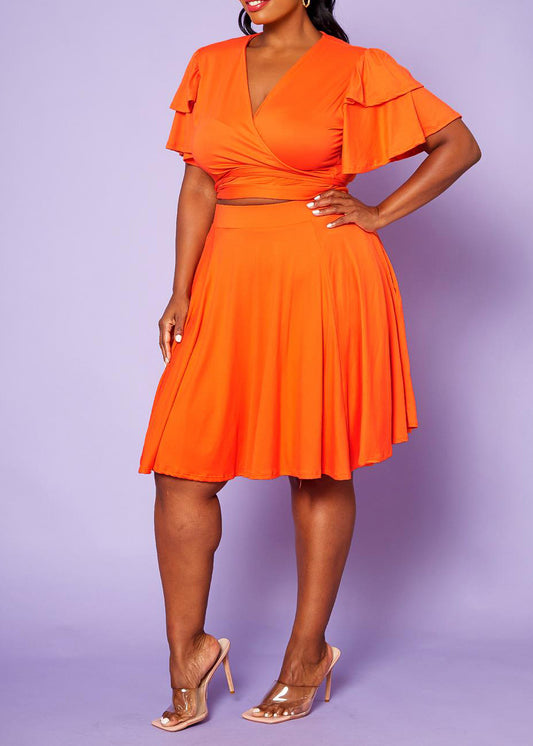 Hi Curvy Plus Size Ruffle Sleeve Wrap Blouse & Flare Skirt Set