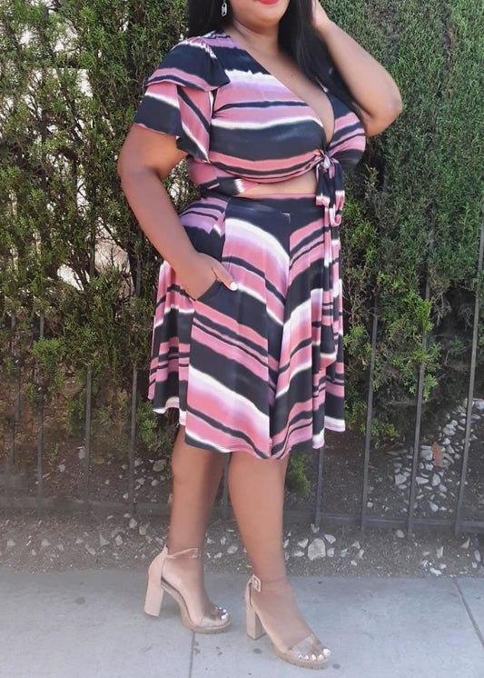 Hi Curvy Plus Size Women Multi Stripe Print Wrap Top & Flare Skirt Set