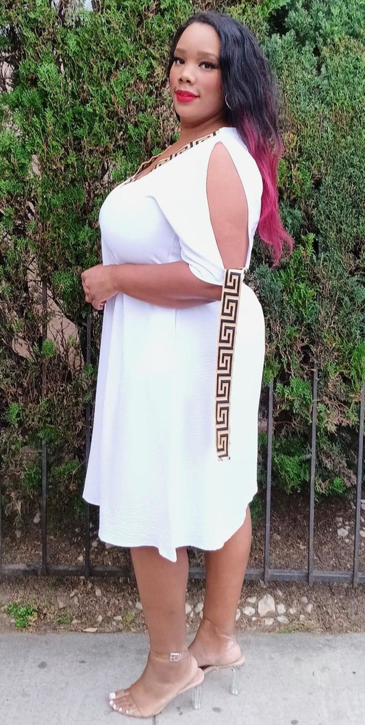 Plus Size V-Neck Geometric Trim Elegance Cold Shoulder Knee Dress