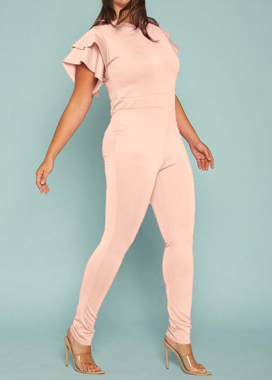 Plus Size Mock Neck Ruffled Short Sleeves Banded Waist Zipper Closure Back Jumpsuit