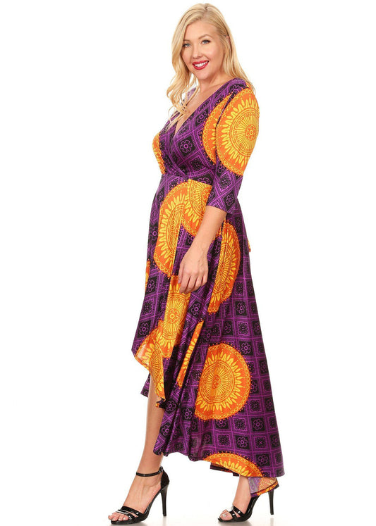 Plus Size Women Mixed Mandala Printed Waist tie Hi-Low Flare Maxi Dress