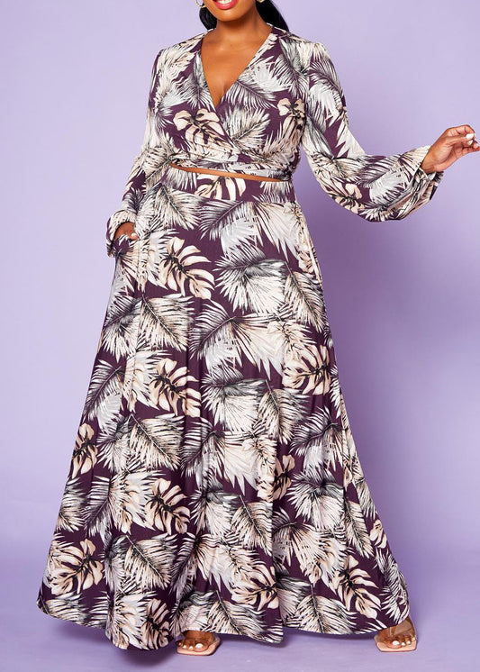Hi Curvy Plus Size Abstract Bold Print Ruffle Sleeve Wrap Blouse & Flare Skirt Set