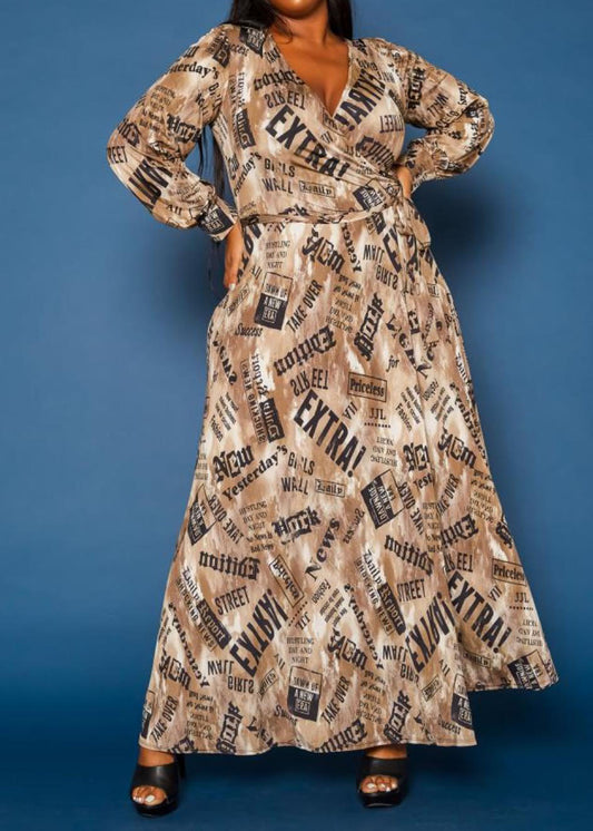 HI Curvy Plus Size Center Of Attention Newsprint Fit & Flare Maxi Dress