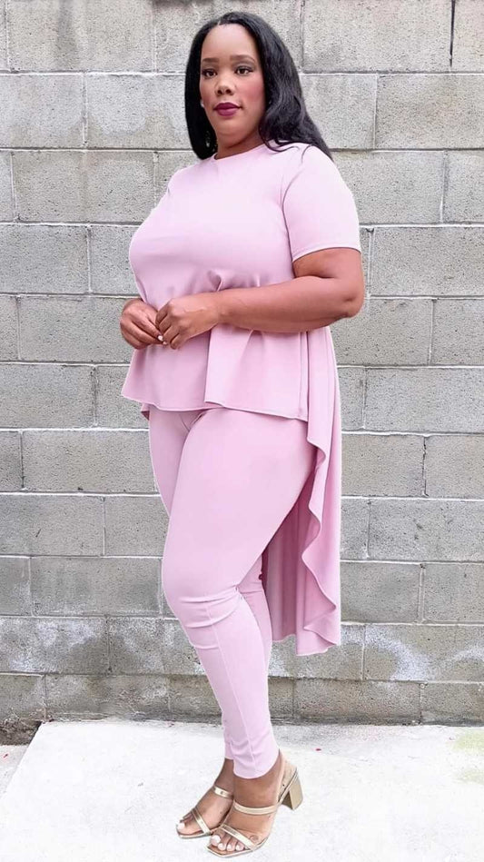 Plus Size Round Neck Short Sleeve Back pleated Top and Pants Set