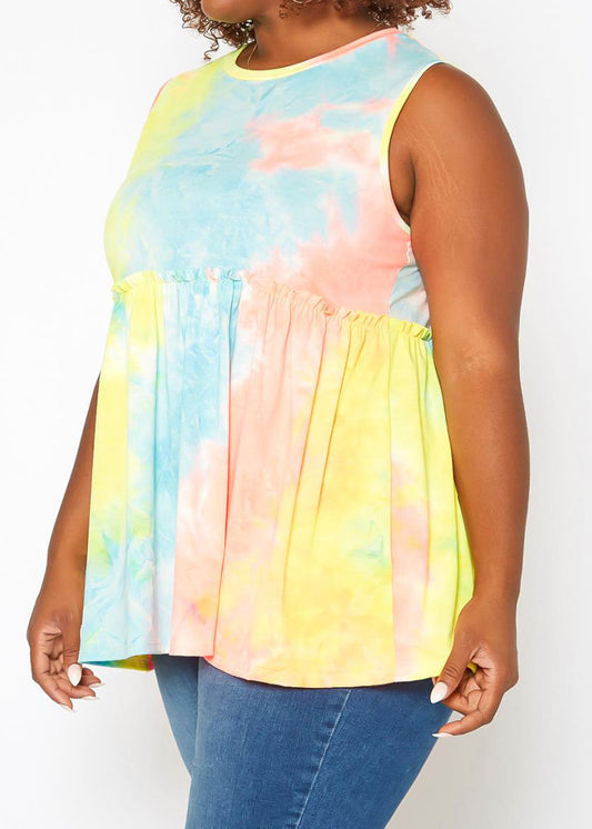 Hi Curvy Plus Size Women Tie Dye Sleeveless Hem Flare Shirt