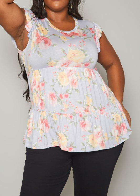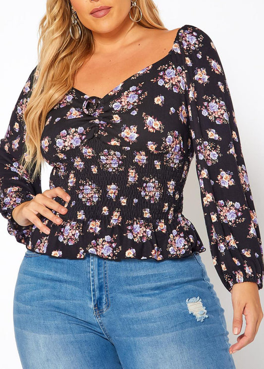 Hi Curvy Plus Size Women Floral Print Smocked V Neck Long Sleeves Shirt