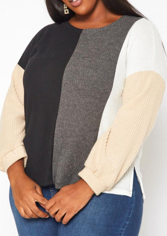 Hi Curvy Plus Size Color Block Waffle Knit Sweater