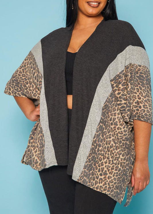 HI Curvy Plus Size Women Leopard Print Color Block Cardigan