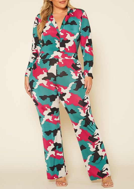 Hi Curvy Plus Size Camo Collared Jumpsuit