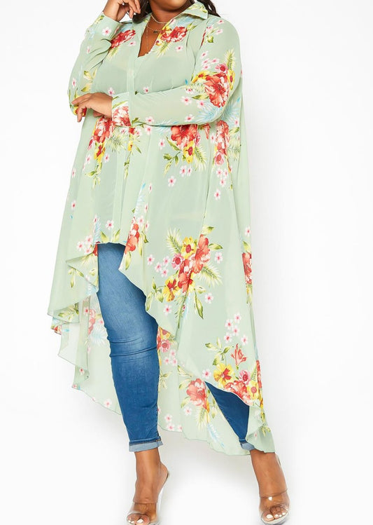HI CURVY Plus Size Floral Print High Low Collar Cardigan