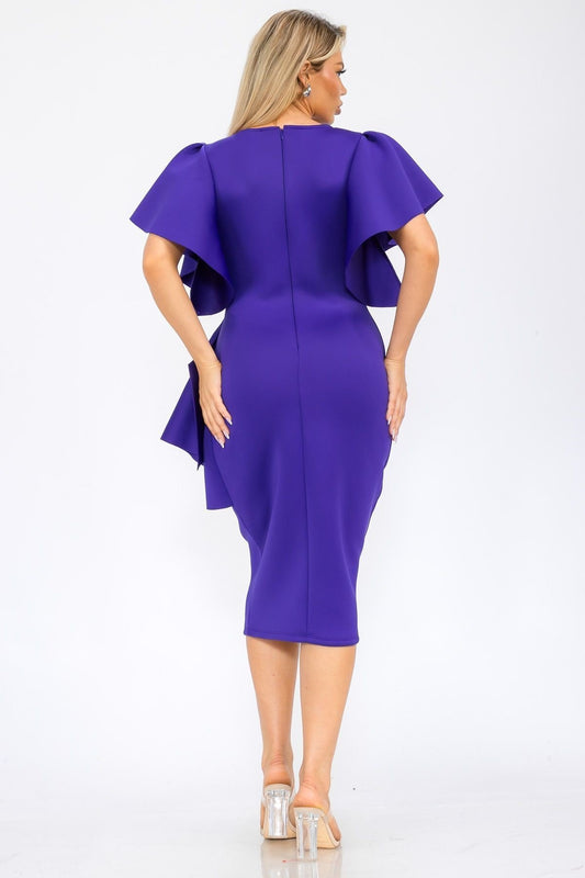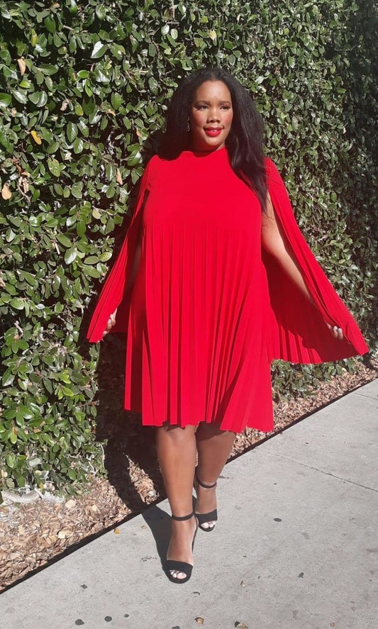 HI Curvy Plus Size Mock Neck Cape Sleeve Keyhole Back Pleated Knee Dress