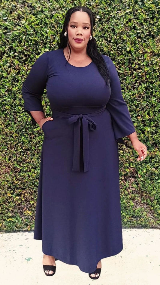 Plus Size Bell Sleeves Round Neck Maxi Flare Dress With Belt and Pockets