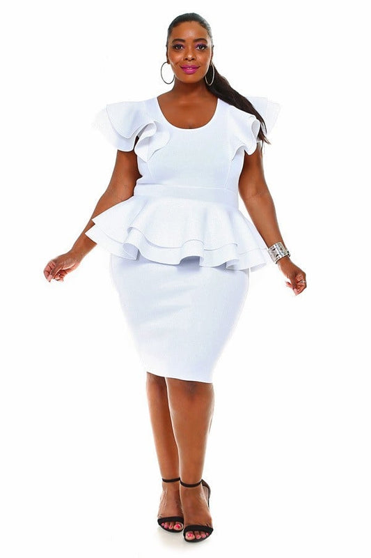 Hi Curvy Plus Size Women Elegant White Cascade Tiered Ruffle MIDI Dress
