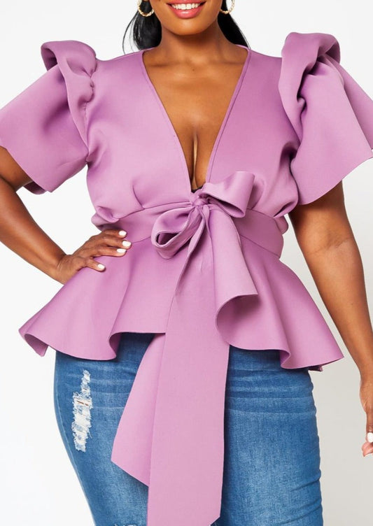 HI Curvy Plus Size Women Tie Front Ruffle Peplum Blouse
