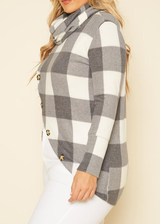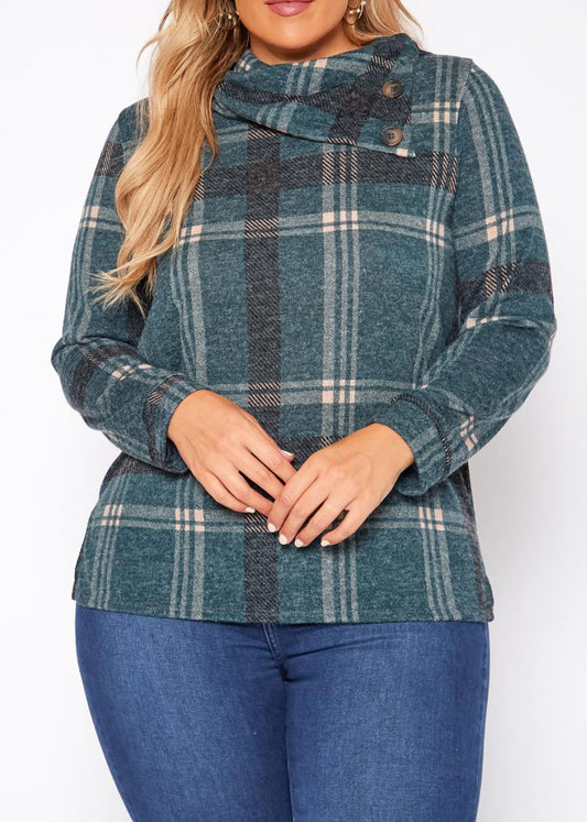 HI Curvy Plus Size Plaid Print Asymmetric Neck Long Sleeves Sweater