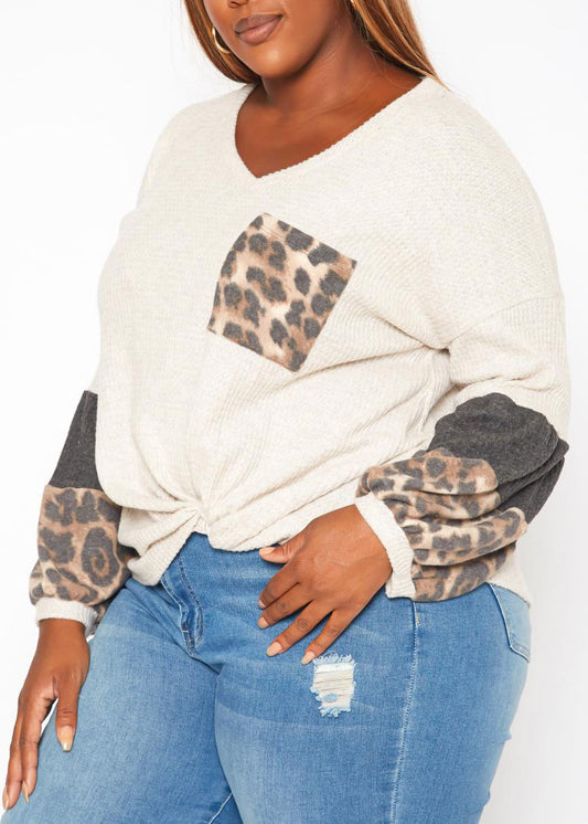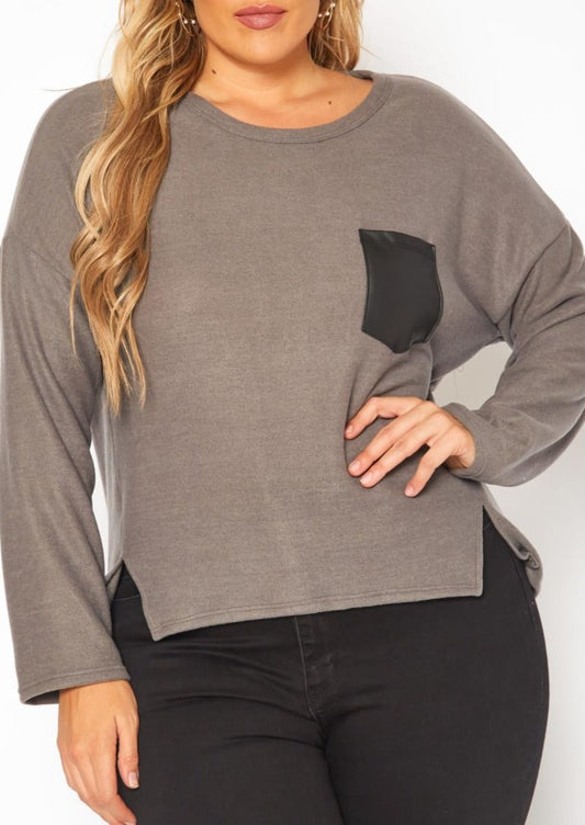HI Curvy Plus Size Women Faux Leather Pocket Hem Sweater